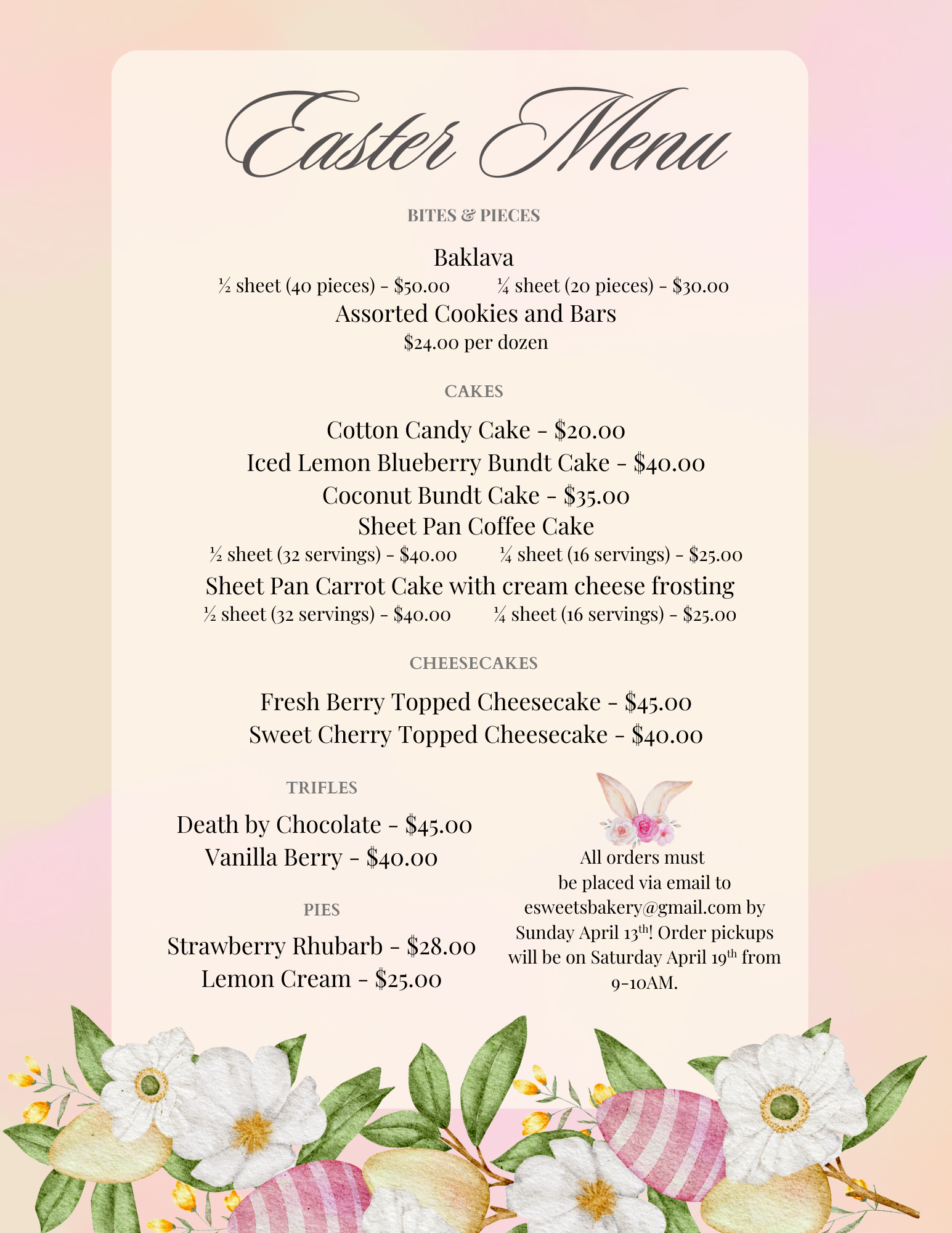 Order your holiday desserts now! All orders must be placed via email to esweetsbakery@gmail.com by April 13th. Order pickups will be Saturday April 19th from 9-10AM. Get your Easter goodies now!